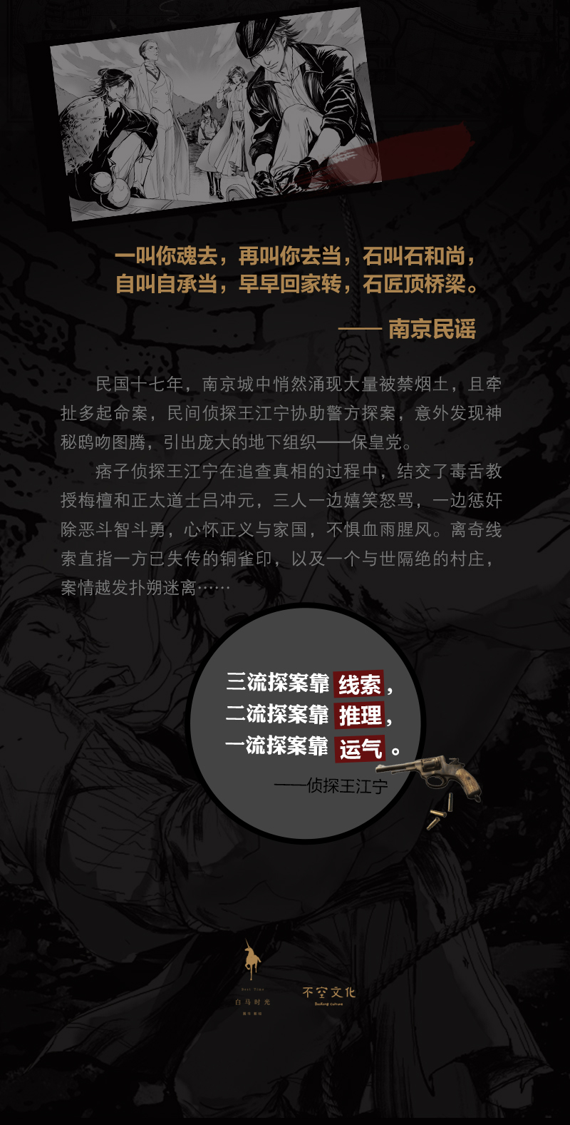 民国十七年,南京城中悄然涌现大量被禁烟土,且牵扯多起命案,民间侦探王江宁协助警方探案,意外发现神秘鸱吻图腾,引出庞大的地下组织——保皇党。